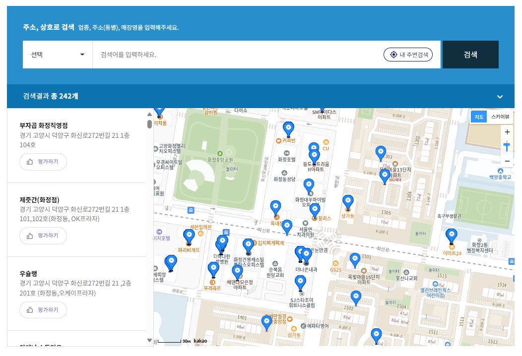 지역을 고양시로 선택하고 원하는 업종을 설정하면 더욱더 쉽게 주변 가게를 찾으실 수 있습니다.