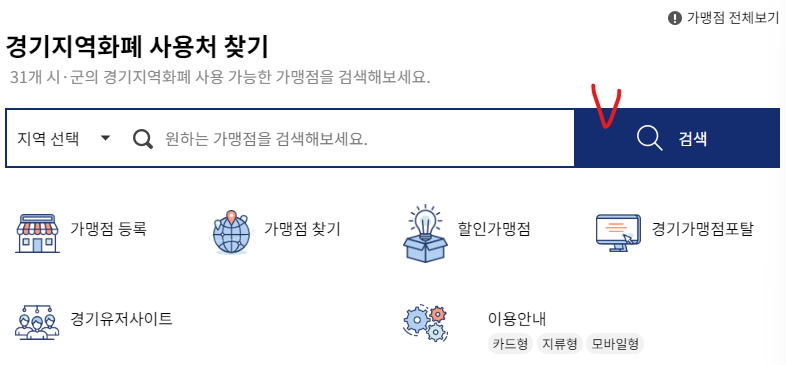 경기지역화폐 홈페이지(https://www.gmoney.or.kr/base/main/view#)에서는 각 지역별로 사용가능한 가맹점을 검색할 수 있는 서비스를 제공하고 있습니다.
