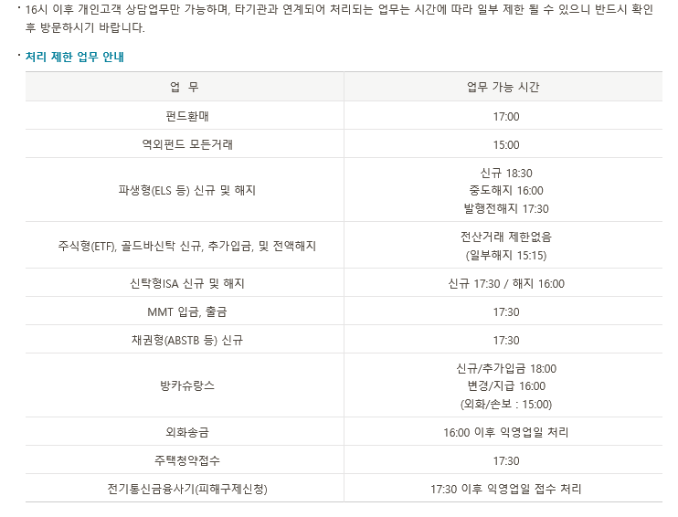 위에서 소개한 국민은행 특화 근무 지점들을 이용할 때 유의할 점이 있습니다. 일반적인 업무시간 이외에는 처리 불가능한 업무도 있으니 아래 표를 참고해주시길 바랍니다.