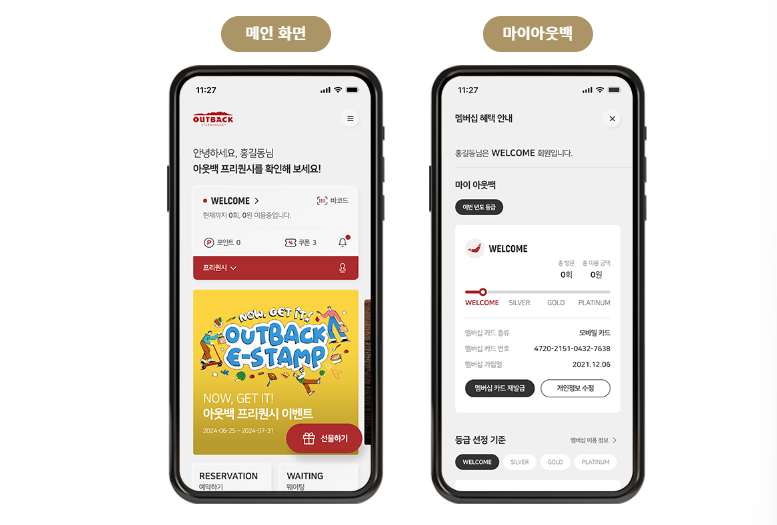 10%할인 받을 수 있는 아웃백멤버십은 공식 홈페이지 / 모바일 어플을 통해 가입할 수 있습니다. 가입절차는 간단하며 가입 시 바로 사용할 수 있는 웰컴 쿠폰이 제공됩니다.