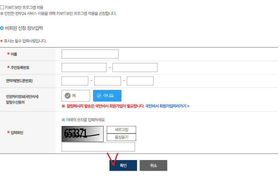 2️⃣ 비회원신청 선택 -> 개인정보 입력 "확인"