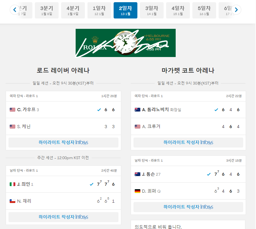 호주오픈 홈페이지에서는 이렇게 매일 경기 일정을 공유하고 있습니다. 하루에도 굉장히 많은 경기들이 예정되어 있네요.